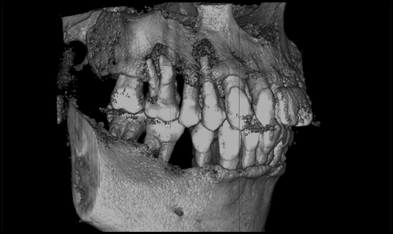 CTの3Dで観察すると右上6番の根が骨についておらず、抜歯前に今後の治療方針