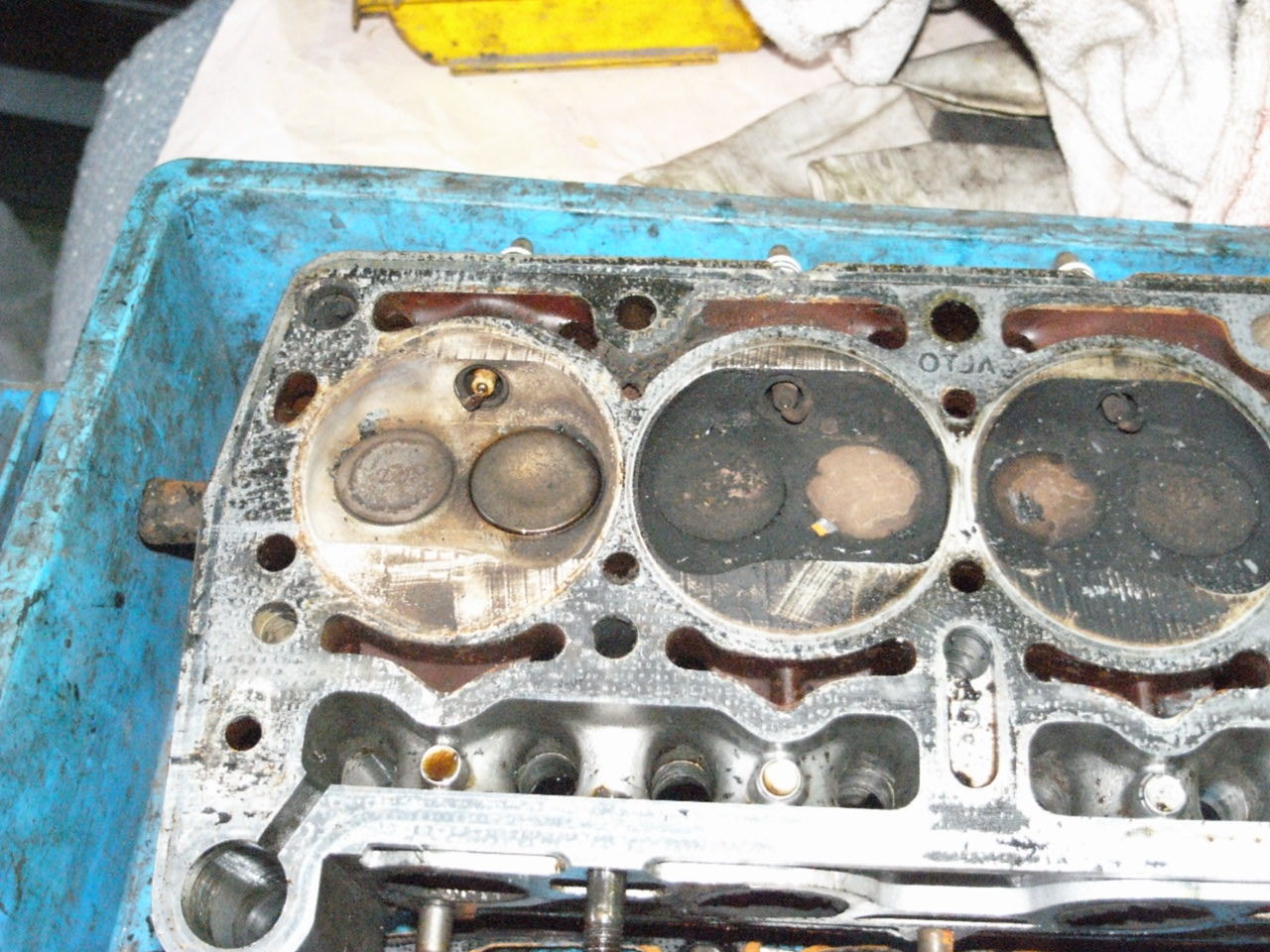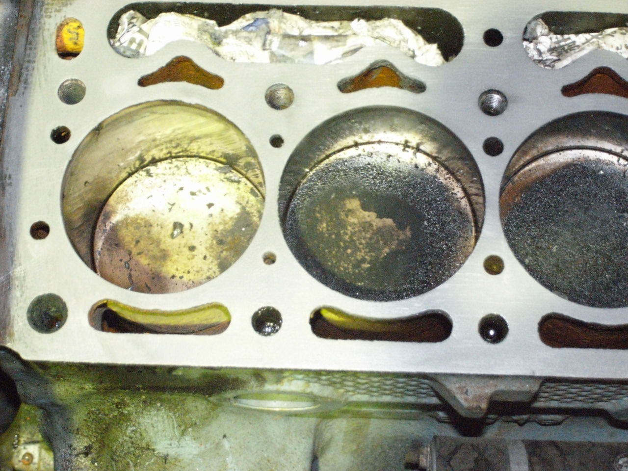 シリンダーから覗いてるピストンヘッド・・1気筒、水混入でカーボンが取れてます