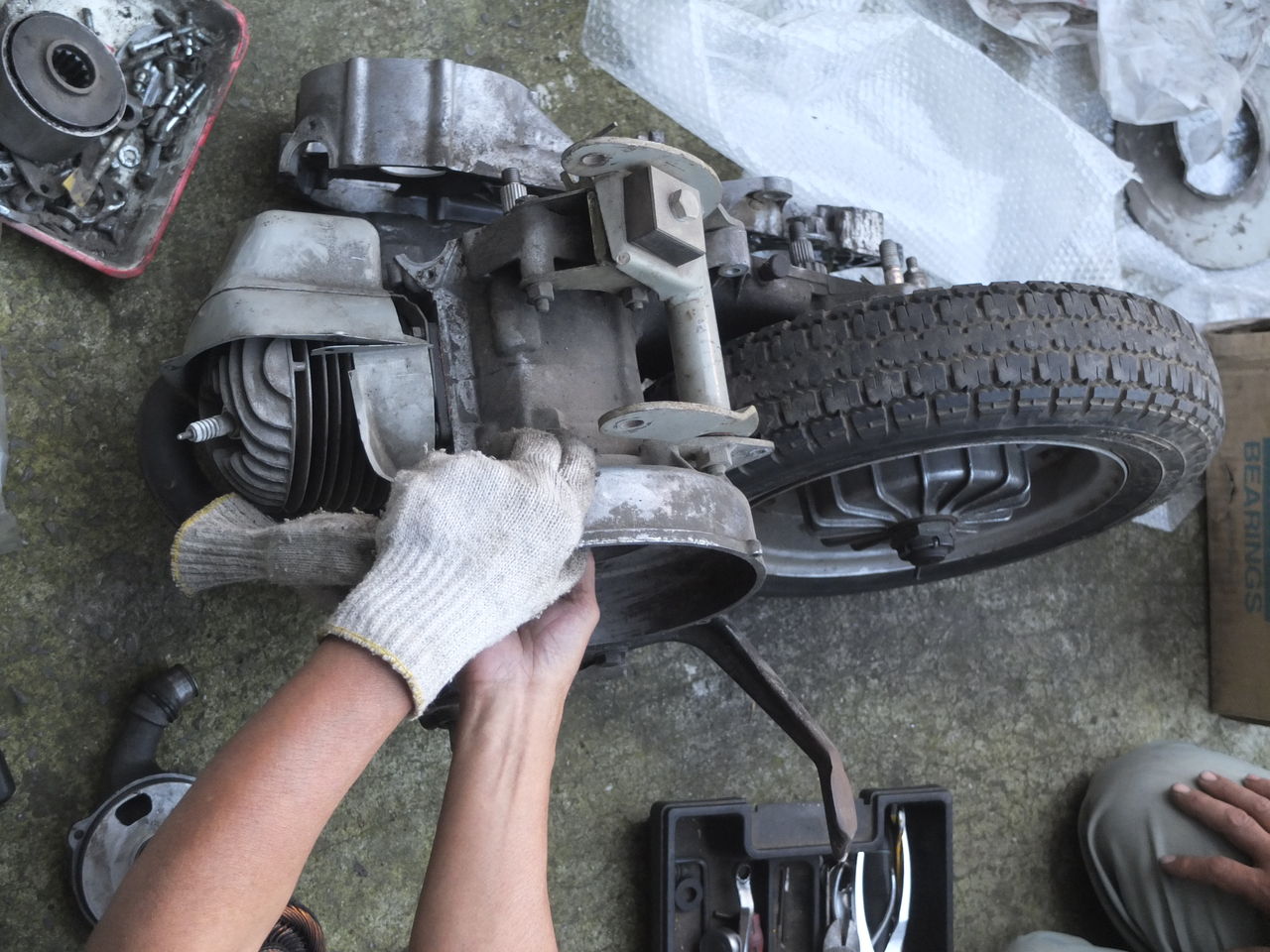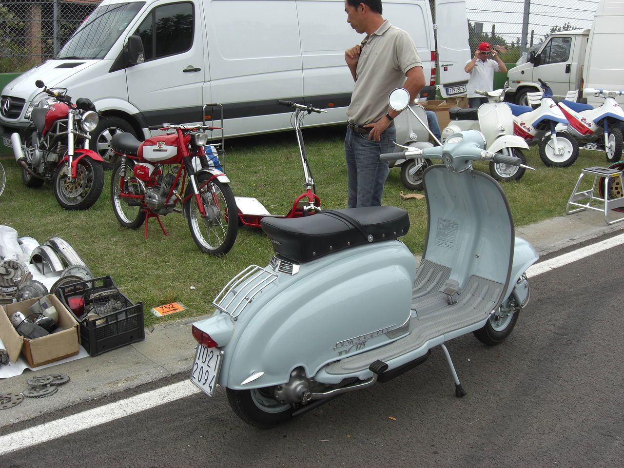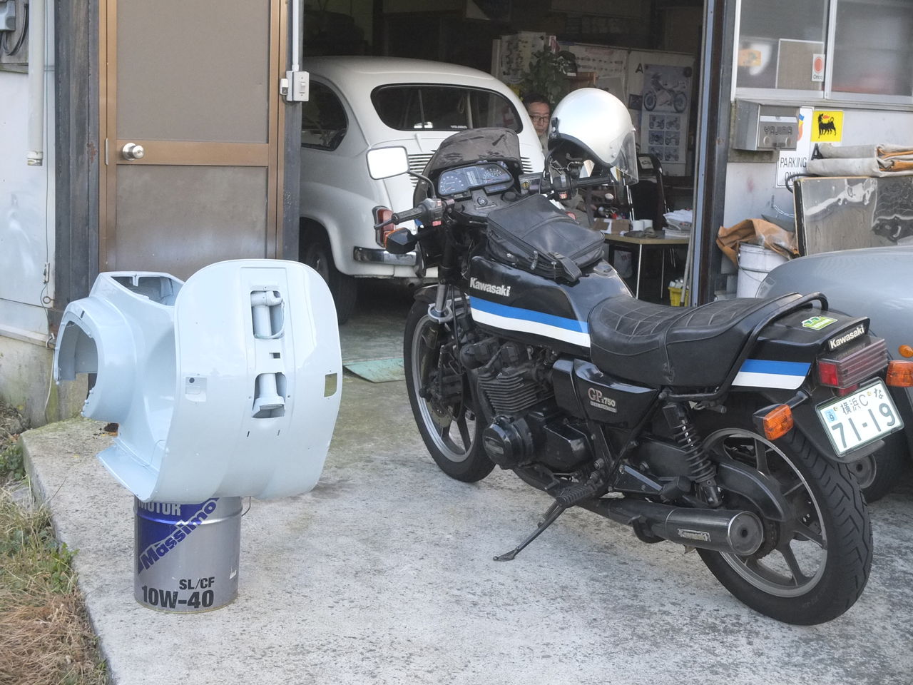 GPZの隣に写っているのは、Yさん(通称Yマネージャー)の凝りに凝った改造VESPA PK のフレームで、