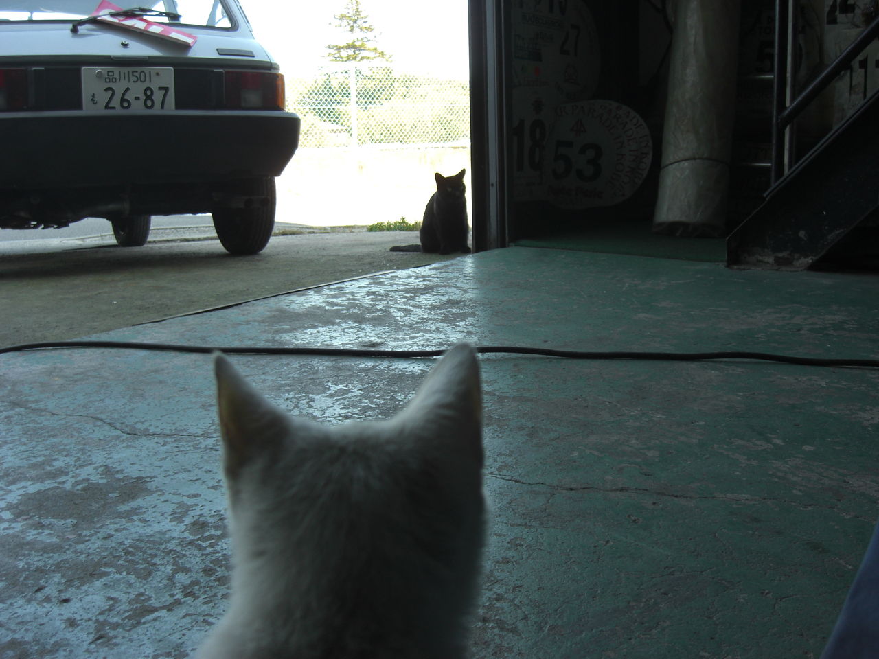 手前のガレージ猫が、侵入猫を見張っています。 最近は、人に慣れてきたので、猫の気が向けば、さわらせてもらえます。