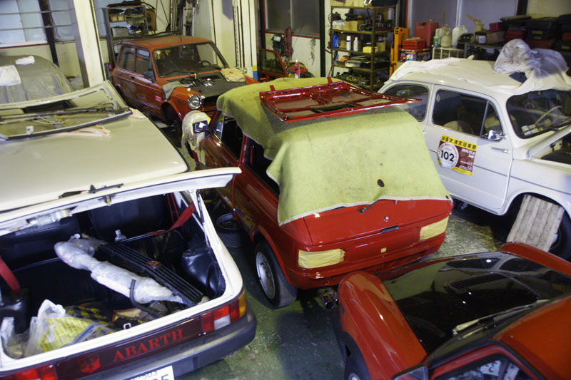 極暑の次は台風と、目まぐるしい7月の終わりです。 台風が去った週末は、ガレージがまたまた満タンになってしまいました。6台も、イタリア小型車がひしめきあってます。FIAT600一族と、A112 一族がこれだけ生息しているガレージも希だとは思いますが、ご近所から全国一円のFiat600 A112 とabarth一族のレストアと修理を専門に行ってますので、お好きな方は是非来訪ください。