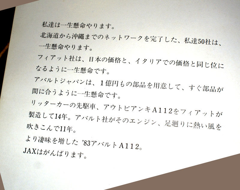 ´¨¤¤Æü¤¬Â³¤¯Ãæ¡¢²£ÉͤΥ«¥í¥Ã¥Ä¥¨¥ê¥¢¡¦¥ä¥¸¥Þ¤³¤È¡¢¥ä¥¸¥Þ¤Î¥¬¥ì¡¼¥¸¤ÎÃæ¤â³°¤âA112¤ÎÁã·¢¾õÂÖ¤¬²Ã®¤·¤Æ¤¤¤Þ¤¹¡£¡¡¤½¤ÎÃæ¡¢Å¬Å٤ˡ¢¥ì¥È¥í¤ÊFIAT¾®·¿¼Ö¤¬¥á¥ó¥Æ¤Ëˬ¤ì¤ë¤Î¤Ç¡¢¼þ°Ï¤ÎȪ¤È¤«·Ú¥È¥é¤µ¤¨¸«¤Ê¤±¤ì¤Ð¡¢¤³¤³¤ÏËÌ¥¤¥¿¥ê¥¢¤ÎÅļˤΥ¬¥ì¡¼¥¸¤«¡ª¡¡ÌµÍý¤ä¤ê¤Ë»×¤¨¤ë¤³¤Îº¢¤Ç¤¹¡£