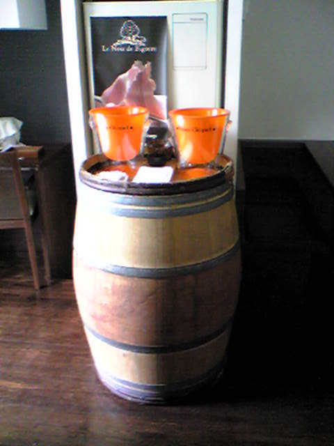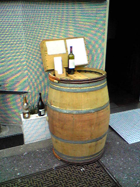 もうひとつは外の入り口脇に置きました。なんといっても「ワインがありますよ」ってカンジが一目でわかるし、このデカイ物が圧倒的な存在感を出しますよね。