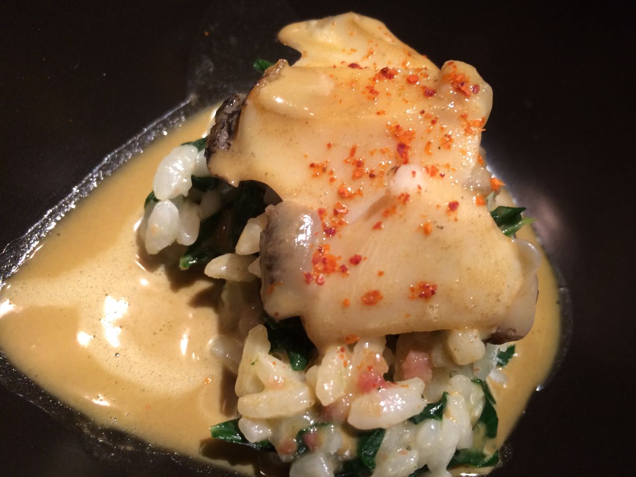 蝦夷あわびとほうれん草のアロス肝のソース