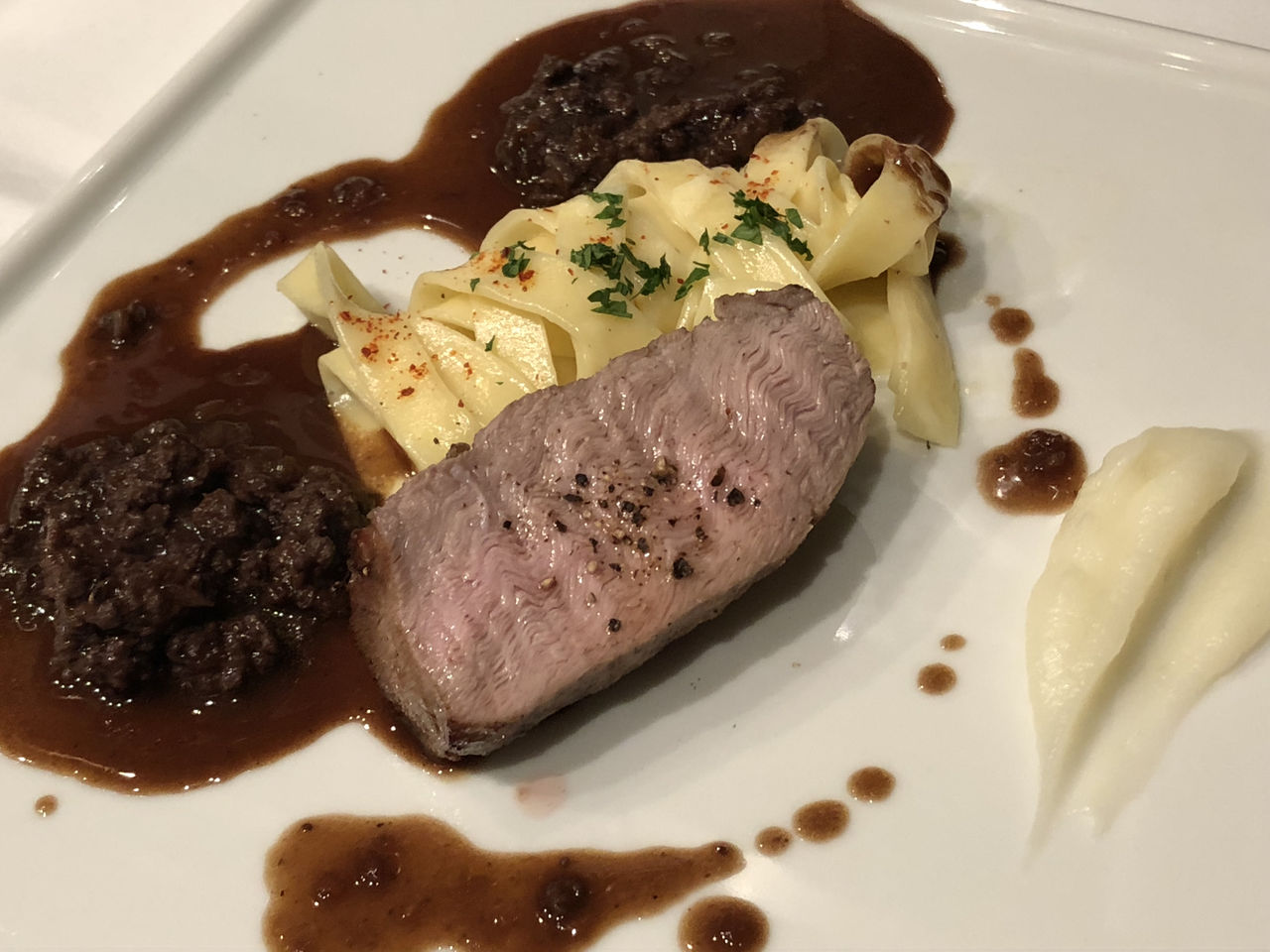 イノシシ背肉のロースト アショアの赤ワインソース ヌイユ 根セロリピューレ