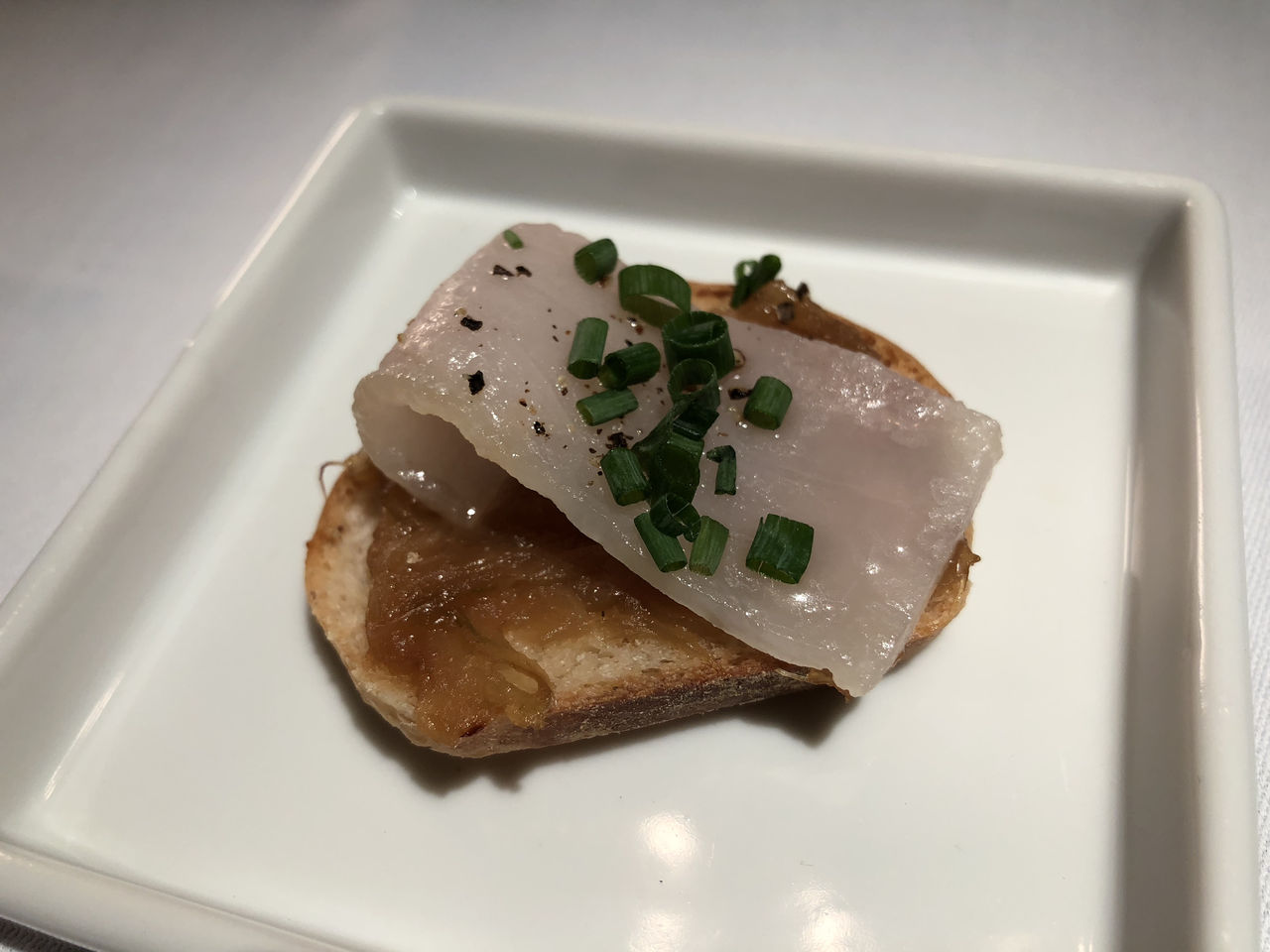 自家製キントア豚ラルド 玉ネギフォンデュのピンチョ