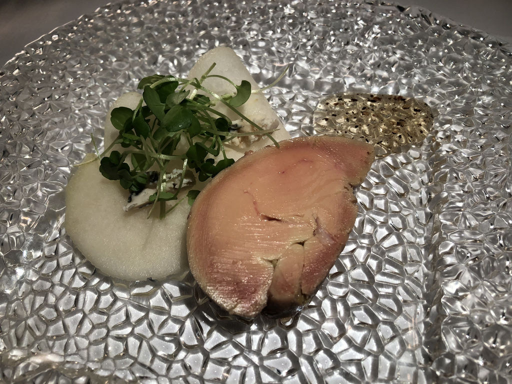 フォアグラのポシェ、アルマニャック風味 洋梨とブルーチーズソース クレソンサラダ