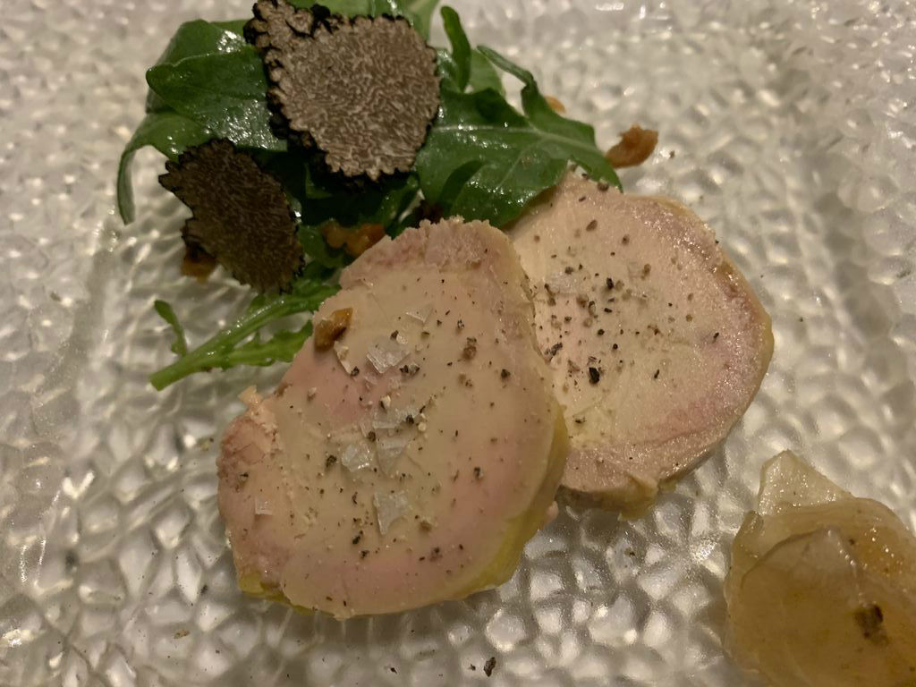 鴨フォアグラのテリーヌ 新生姜のコンポートルッコラサラダ サマートリュフ