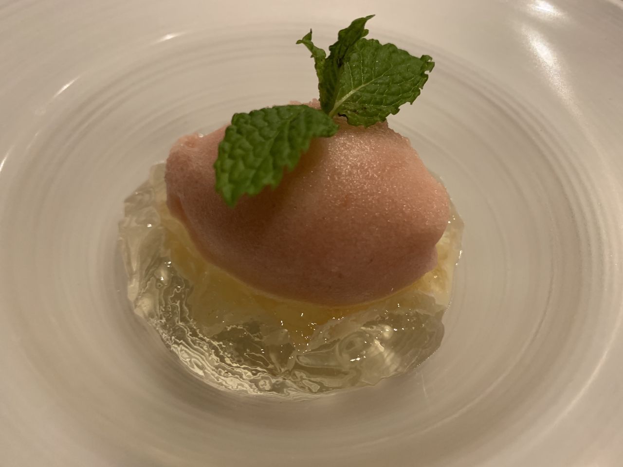 白桃のソルベ 甘口白ワインのジュレコーヒーと小菓子付