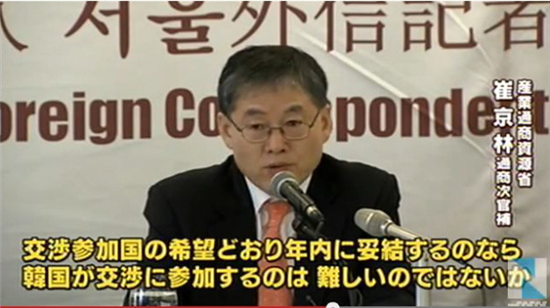 ただ、TPP交渉は年内妥結を目指している。韓国の参加は現在交渉に参加している12か国の同意を得る必要がある。USTRは韓国の参加時期について、現在行われているTPP交渉が完了した後になる、との見通しを示した。