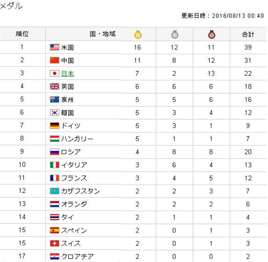 日本勢の金メダルは2012年ロンドン五輪に並ぶ7個となり、米国、中国に次ぐ3位をキープした。