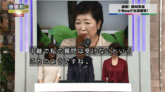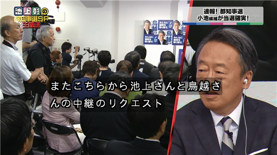 知事選は2016年7月末に行われ、元防衛相の小池百合子氏(64)が、次点の増田寛也・元総務相 (64、自民党など推薦)に110万票以上の差をつけて初当選を果たした。鳥越氏と宇都宮氏は、 知事選の告示前の会談以降では、選挙中・選挙後を通じて、この番組で初めて「会った」と明かした。