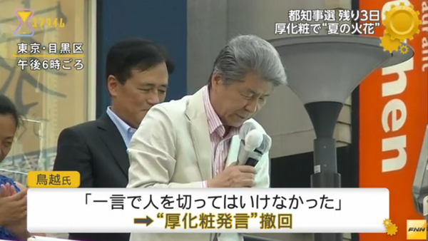 鶏越氏は、このあと、「一言で人を切ってはいけなかった」として、厚化粧発言を撤回した。