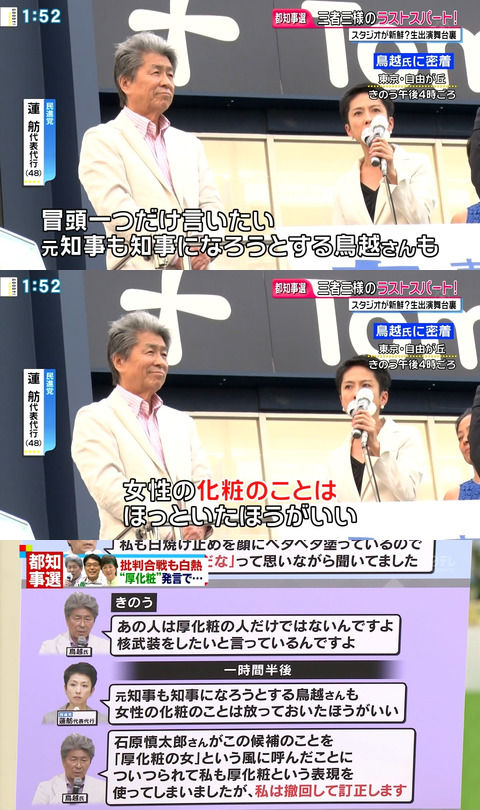 無能鳥越「厚化粧!」⇒ 蓮舫「女の化粧のことは言うな」⇒ 鳥「ついつられて...」撤回訂正 瀬戸内寂聴「厚化粧の人に都知事になって欲しくない!」 2ch 大炎上!