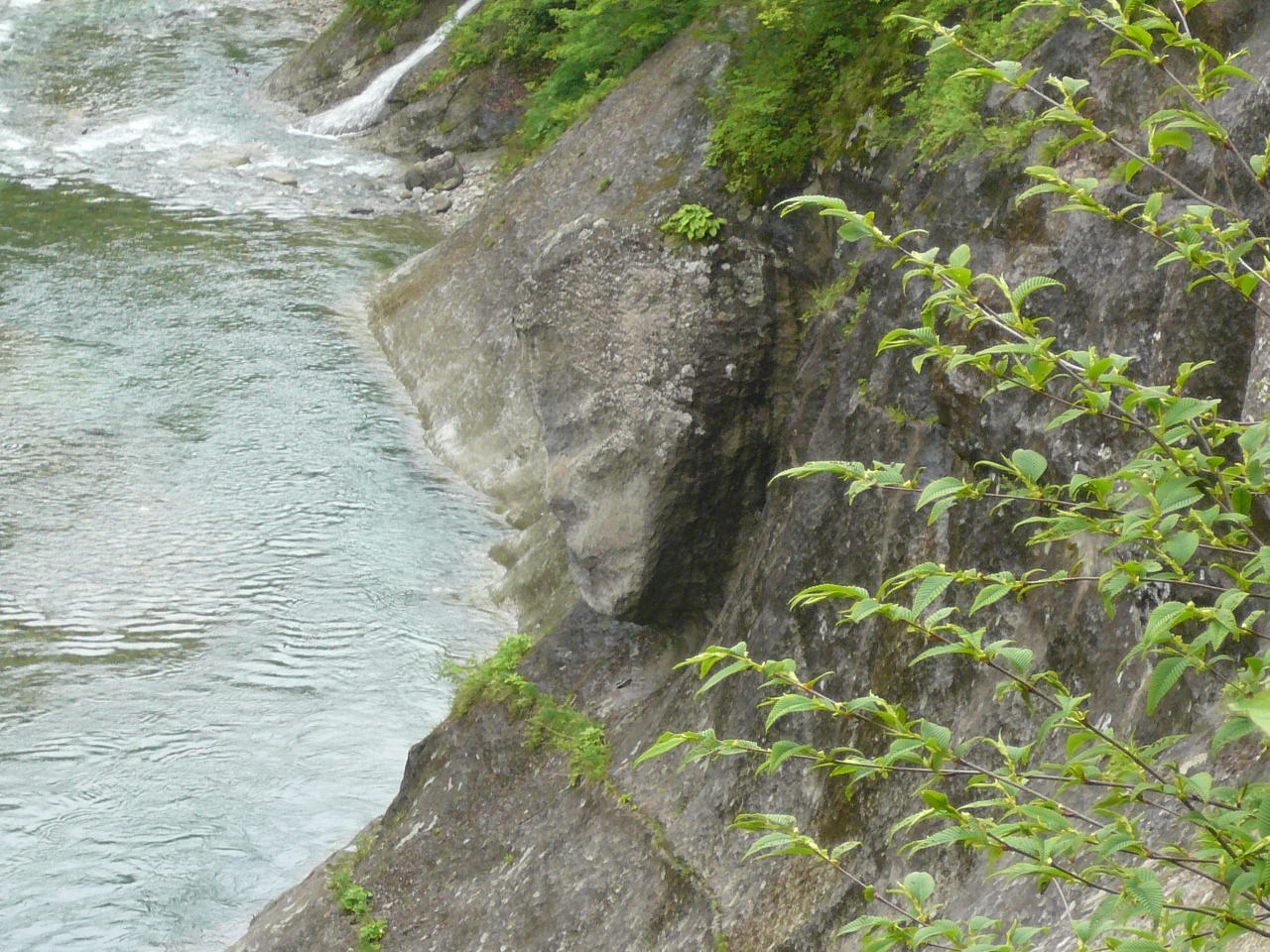 少し歩き、川に向かい歩いて来た方を見ると、川の歩道側の岩肌に