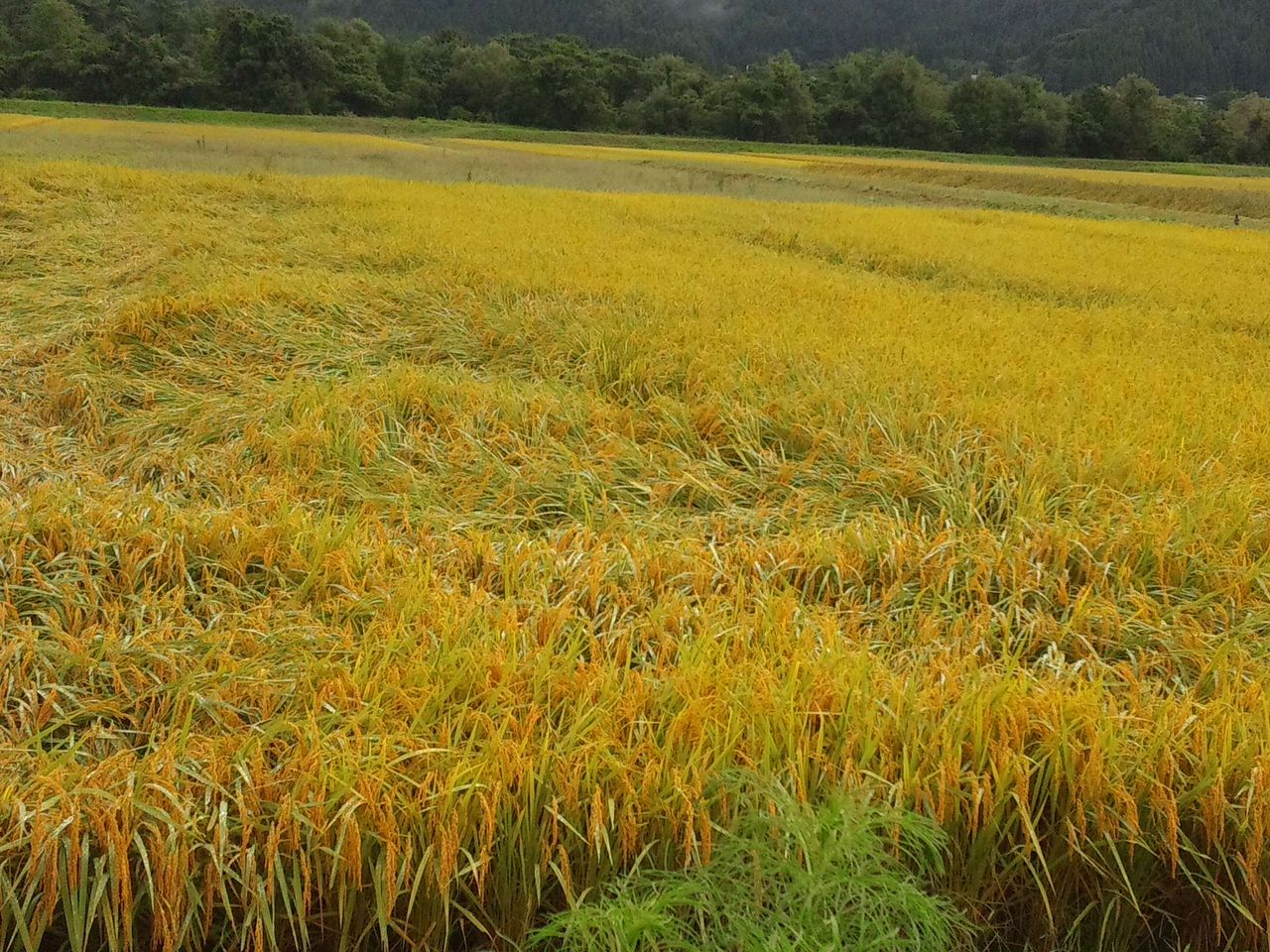 収穫できる実の入った稲は、穂が重く倒伏しやすいです。