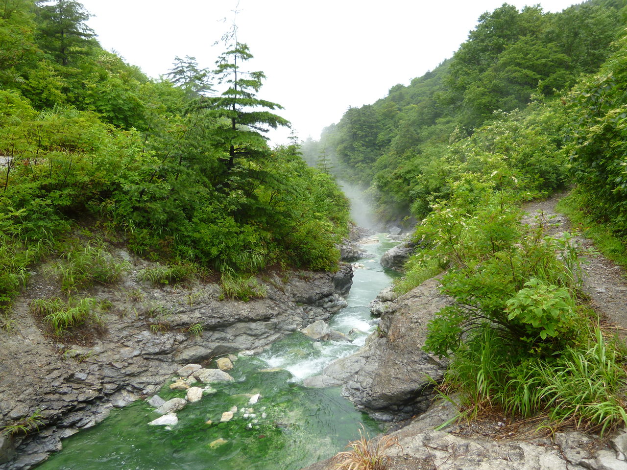 源泉から流れ出た強酸性のお湯は沢水と混じって湯尻沢となり大湯滝へと流れていきます。