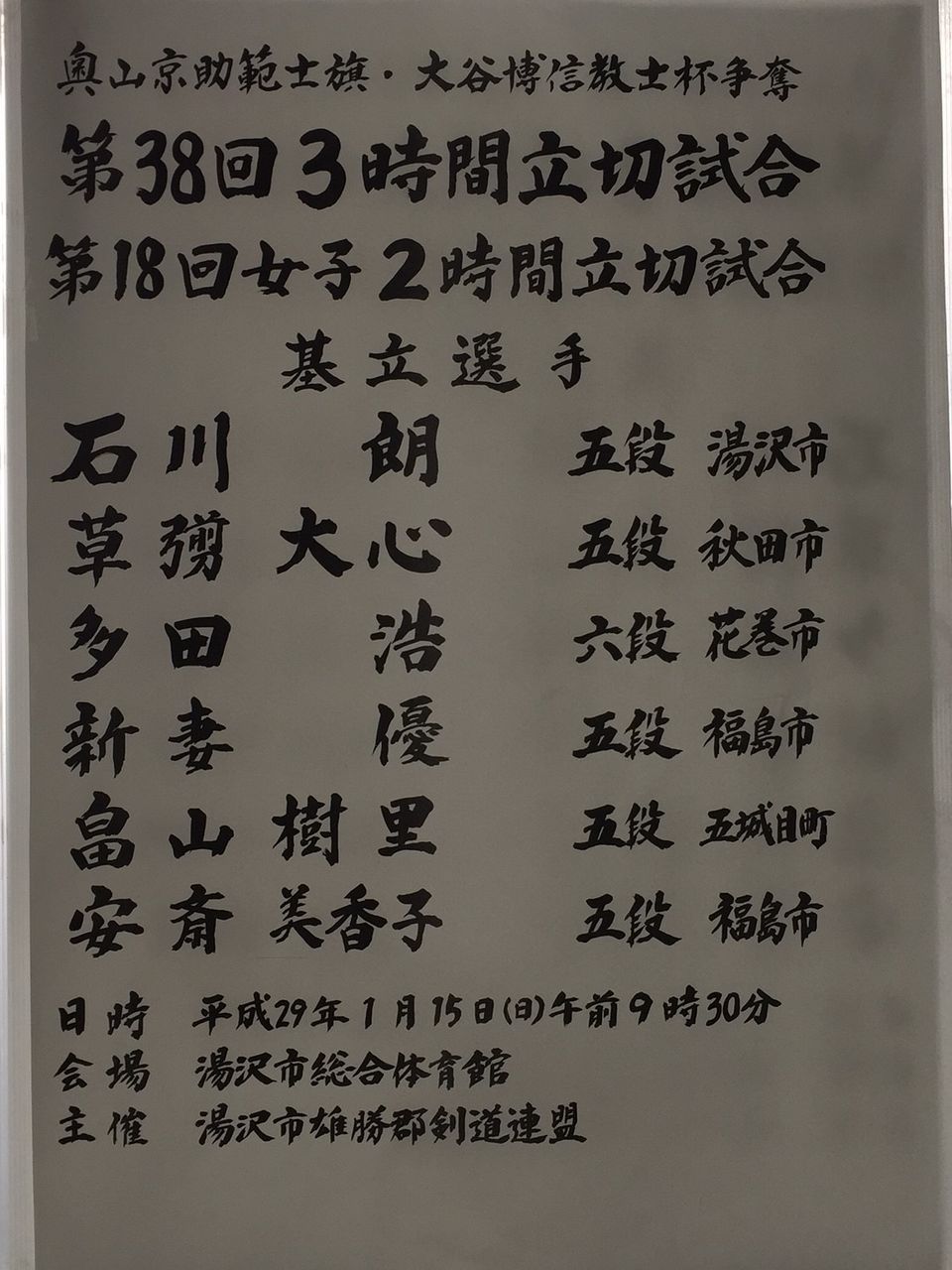 今度の15日日曜日、湯沢総合体育館にて、剣道の立切試合があります。