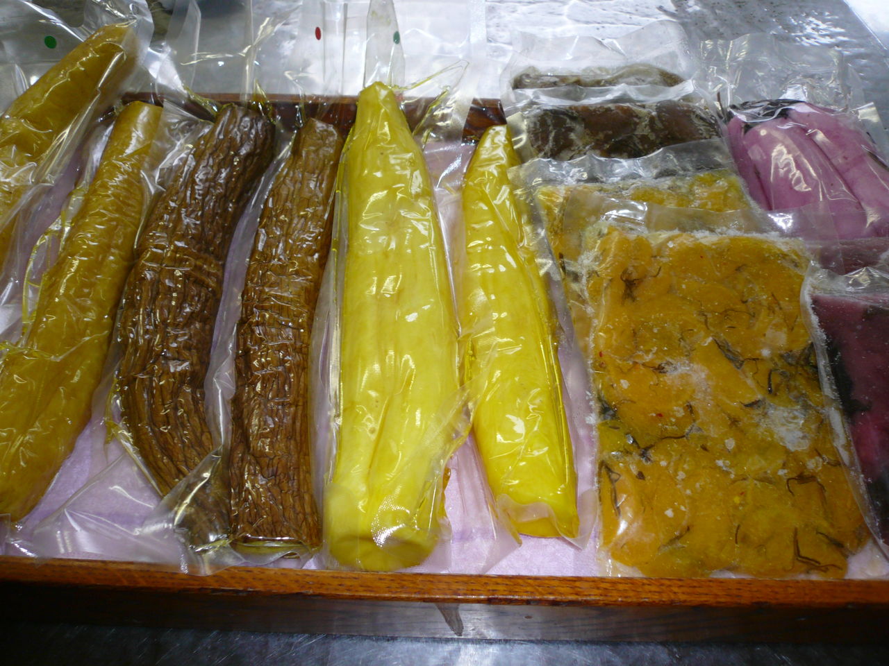 左から 大根干し漬け・いぶり大根・大根生漬け・上いぶりとろろ・下とろろ大根・上大根シソ漬け・下みょうが酢漬け です。