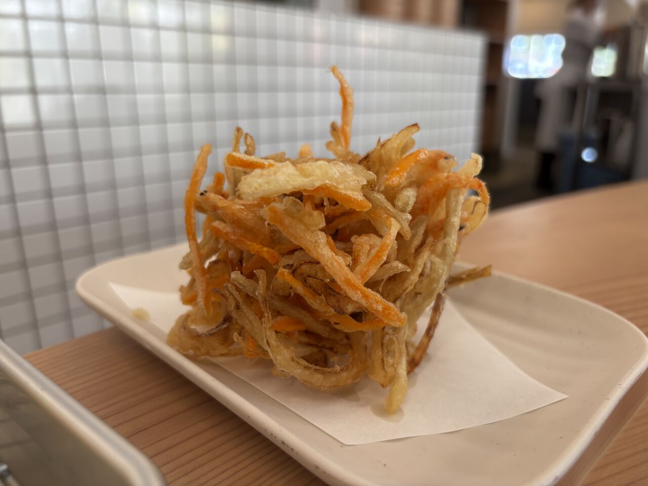 最初に揚がってきたのは・茄子・とうもろこし・さつまいもの野菜天。