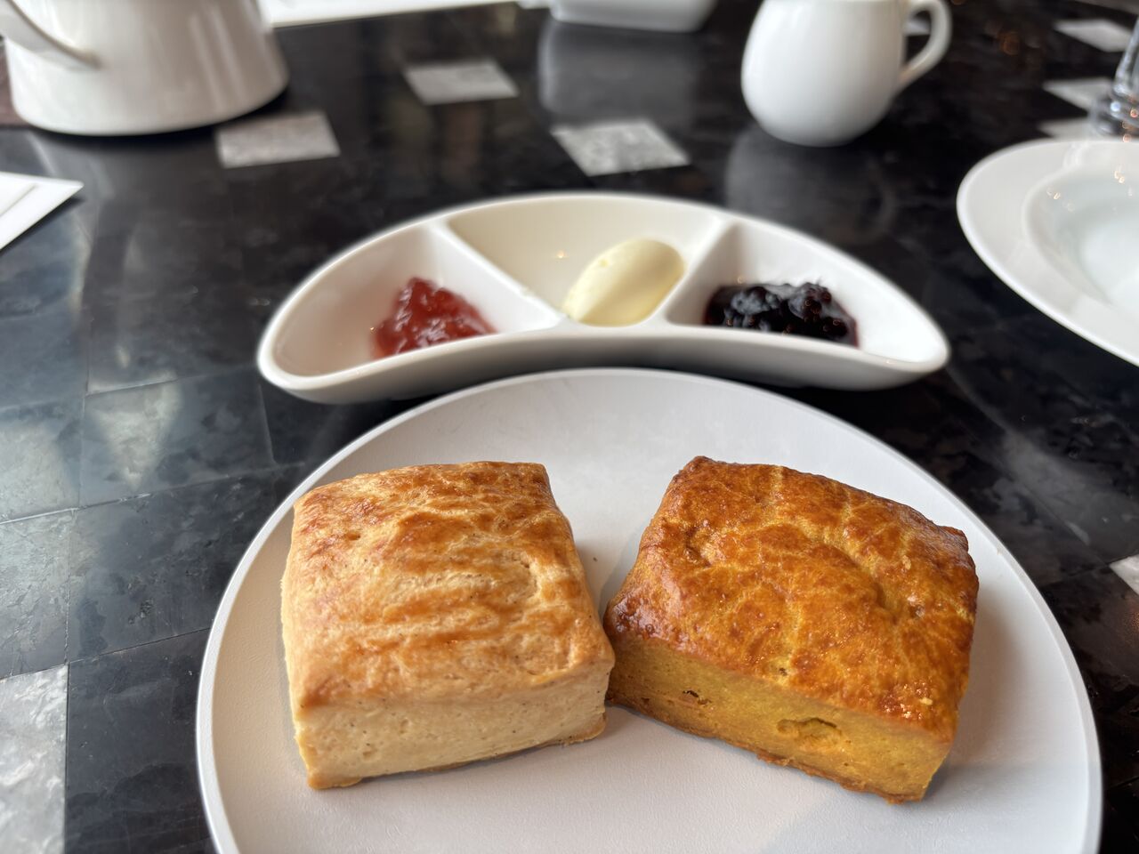 いちごジャム・バニラなどなどをつけながらいただくスコーンはぎゅっと詰まっていて、重量感抜群。セイボリーをいただいた後なので、食べ切る自信が無い方は、テイクアウトも可能です。