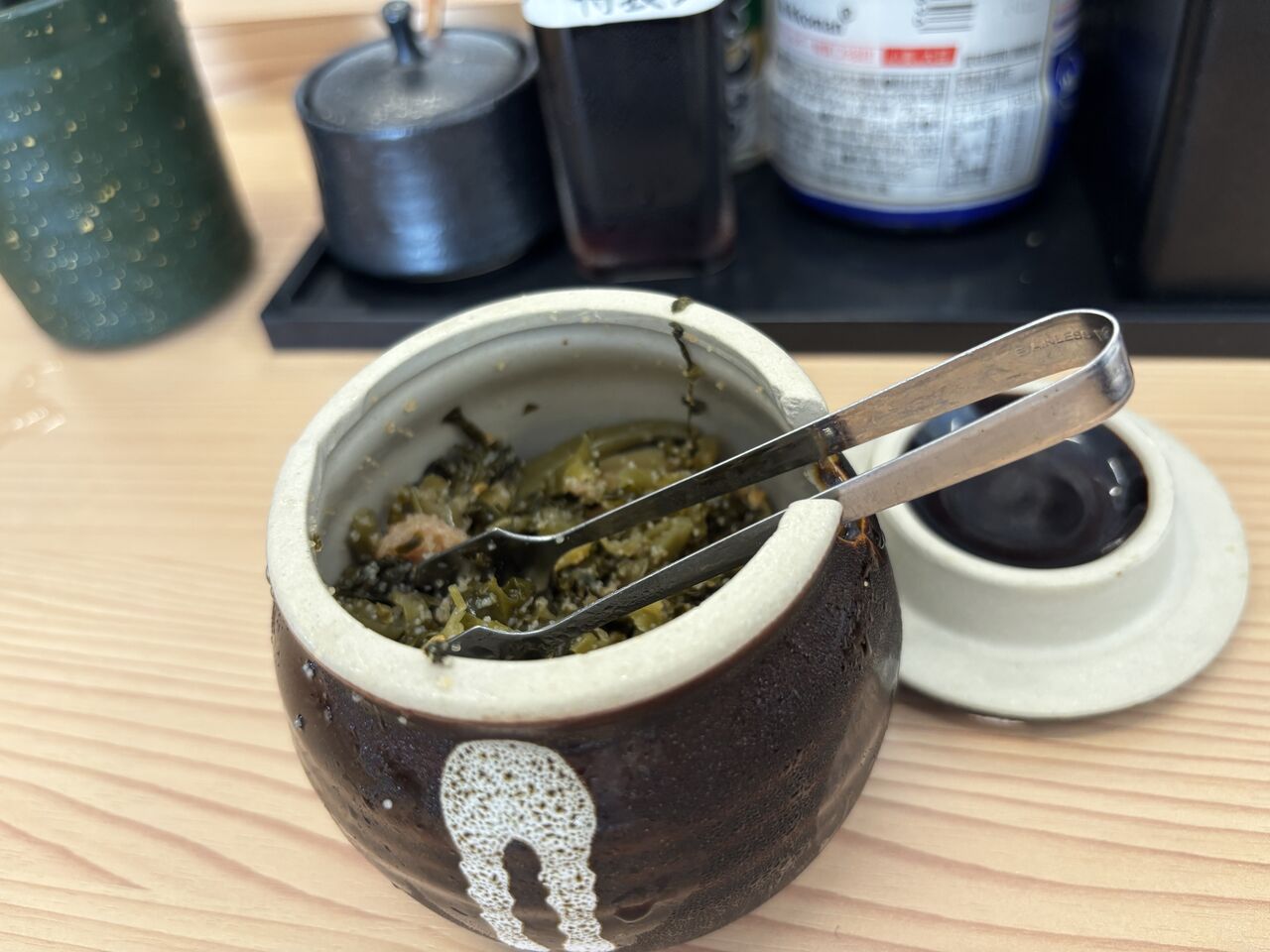 注文すると直ぐにご飯・お味噌汁・天汁・大根おろしが準備されます。天婦羅が揚がるまでは、注文すると持てきてくれる明太高菜でご飯をひと口。