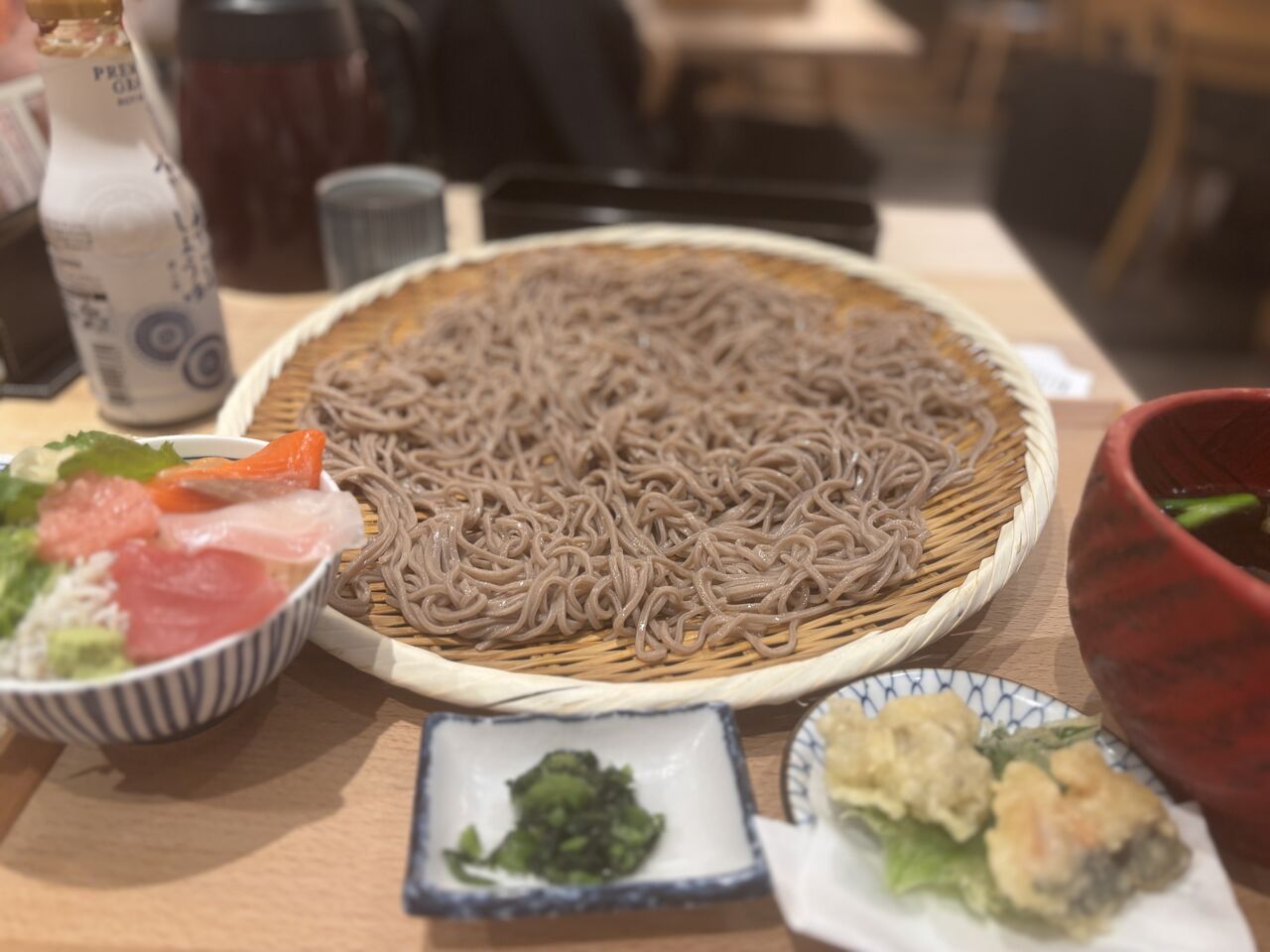 お茶碗に赤身・サーモン・鯛・ネギトロ・しらすが乗ったコンパクトサイズの海鮮丼ですが、お蕎麦の量は結構多めです。
