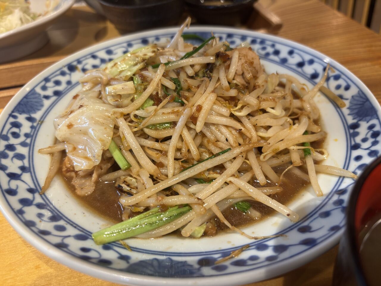 もやしがメインで後はキャベツとニラが少々。それに脂身多めの豚バラ肉。お肉が入っていることで、ボリューム感もあります。お醤油の味付けが濃い目なので、しっかりご飯が進みます。とろろもあるので、物足りなさを感じません。直感で頼んだん肉野菜い炒めですが、美味しかったです。