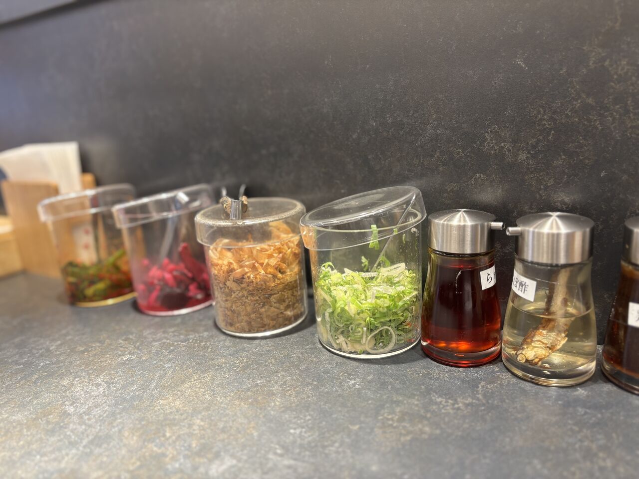 味玉は火入れ具合が丁度良い、しっかりと味が染みて美味しいです。満足度の高い美味しい醤油ラーメンです。一通り味見をしたところで、味変。テーブルの上のトッピングを全て入れてみます。