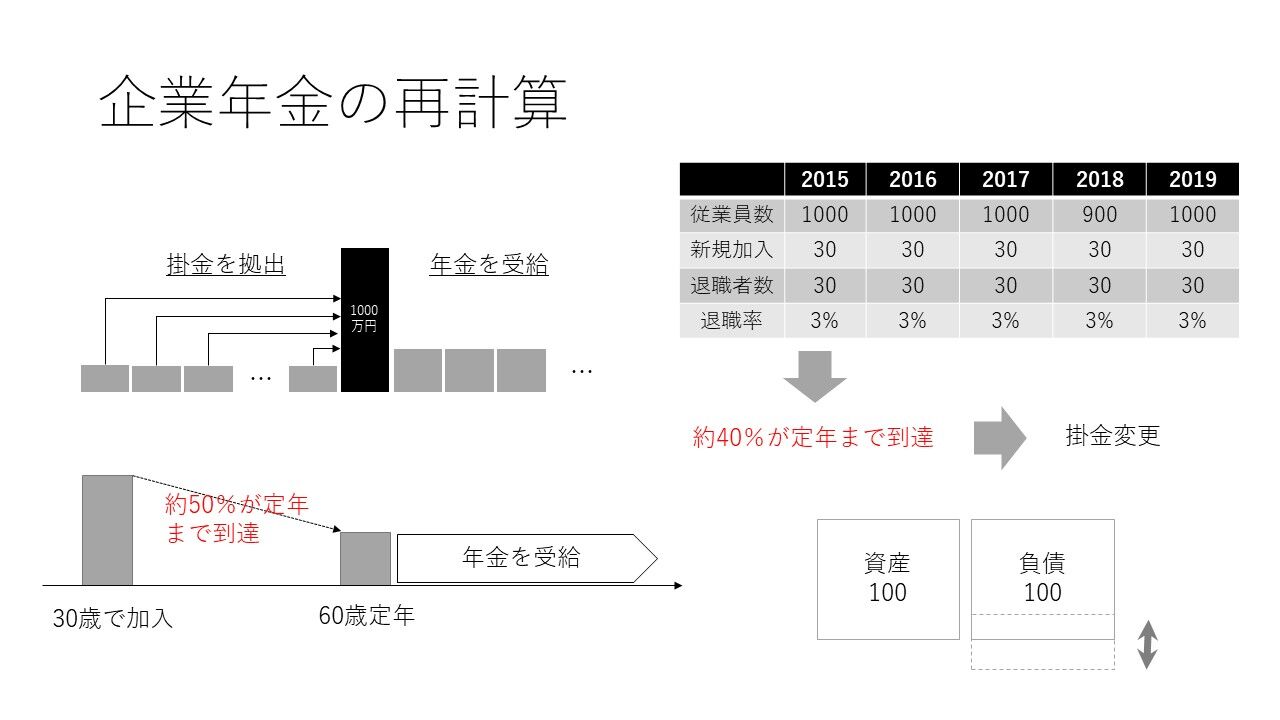 一方、日本のDB制度の場合、一時金額を規定し、それを年金に換算する、という方式で規定されている。その理由は、日本の企業年金の大半は退職金由来だからである。この意味を、具体例を用いてもう少し詳しく見てみたい。