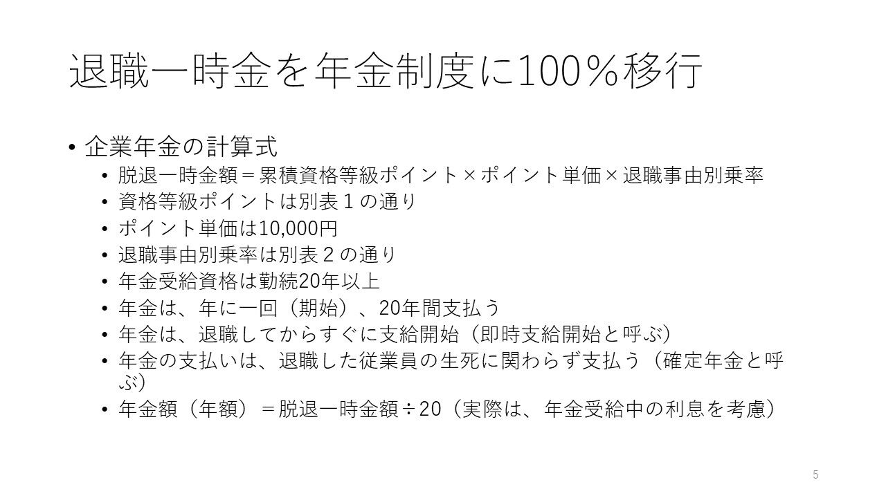従業員の視点からすると、5番目のケースでは、一時金で受け取るか、年金で受け取るかを選択することができる。このように、企業年金を導入すると、受け取り方の選択肢が広がる、というメリットがある。また、単純化のために20で除して年金額を計算したが、実際は一定の利率を仮定した年金現価率で割り算を行う。これは20よりも小さい値となる。分母が小さいので、年金額は増える。単純に分割払いするのではなく、一定の利息を付与した年金額を計算する。低金利下の昨今、この利率を魅力に感じる人も多いのではないかと思う。