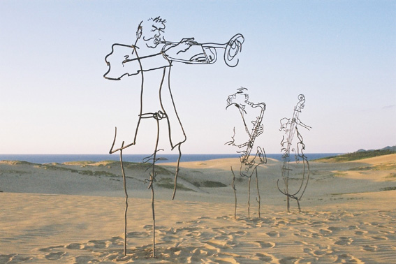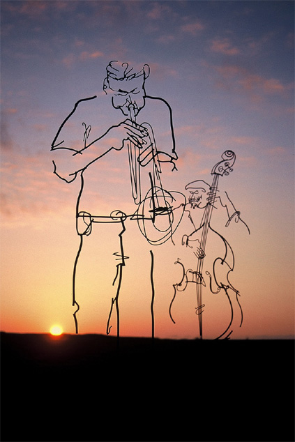 徳持耕一郎さんと出会ったのは3,4年前、知人の神戸のギャラリー春志音の社長須藤氏の紹介による。鉄筋アートの作家と言うことで、マッチョな人をイメージしていたが、実際の徳持さんは繊細な細身の方だった。少年のようなナイーブさを持った人である。彼の作品の凄みはどこから来るのか。一瞬のスイングしているジャズマンの動きを何故こんなに切り取って立体に出来るのか。