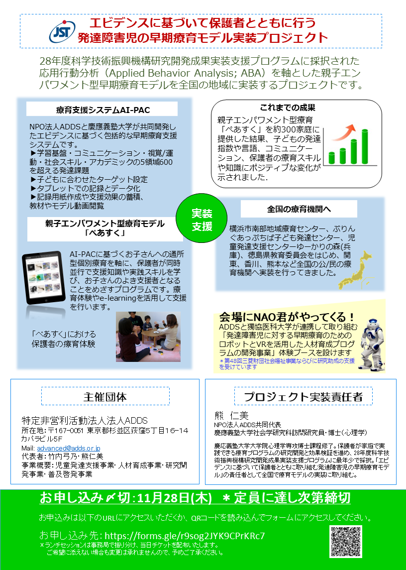 昨年も300名が参加して下さったボリューム満点の会で、お茶の水大学神尾陽子先生、慶應義塾大学山本淳一先生による招待講演では、世界最先端のエビデンスに基づいた療育支援のお話が伺えます。