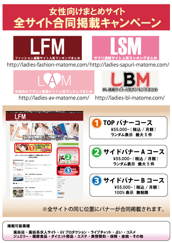 女性向けランキング式まとめサイト【LFM】【LSM】【LAM】【LBM】は各コンテンツごとにランキング形式にまとめたサイトになり、女の子からの支持を得ています。(スマホ対応)