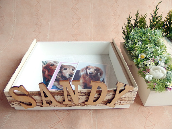 二段の下の方の箱には写真が想い出の品を入れることができます。