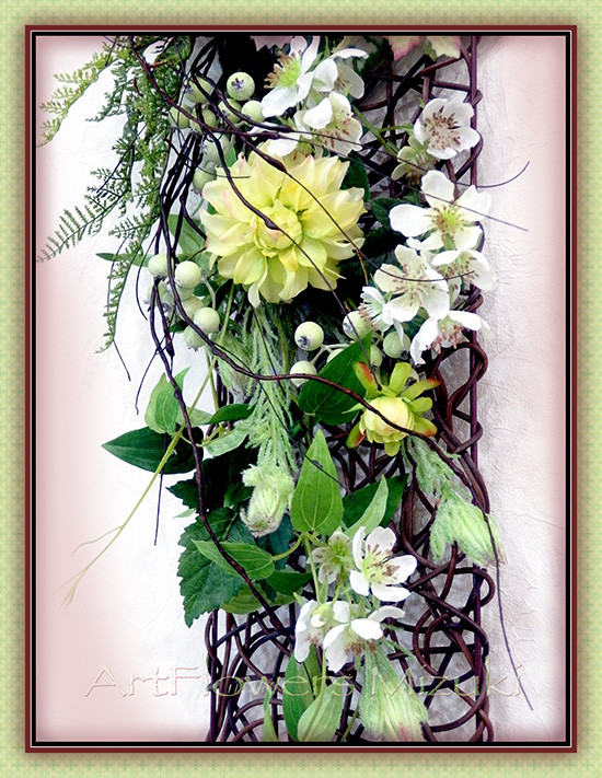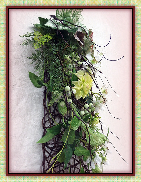 グリーンを中心にお花控えめのナチュラルな壁掛けです。お気に入りはラズベリーフラワー。