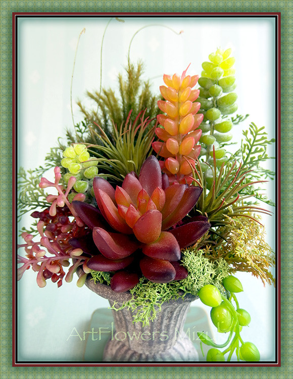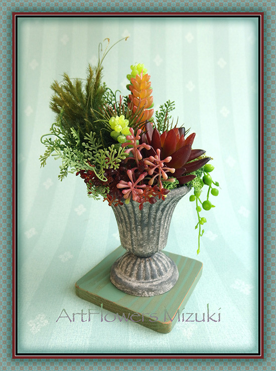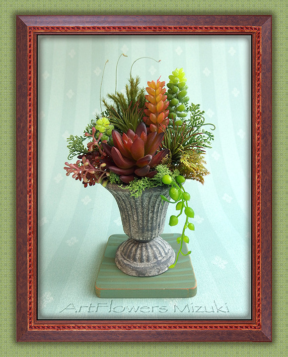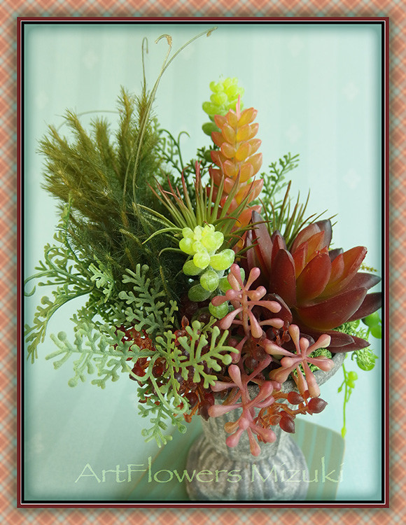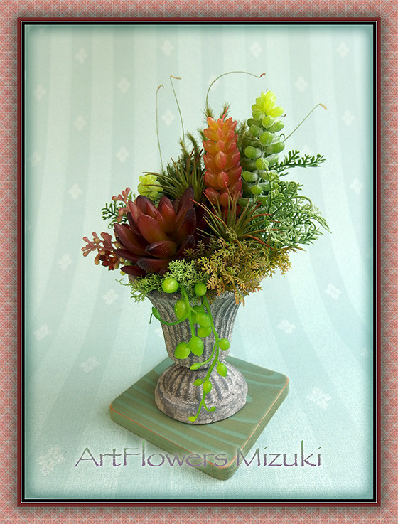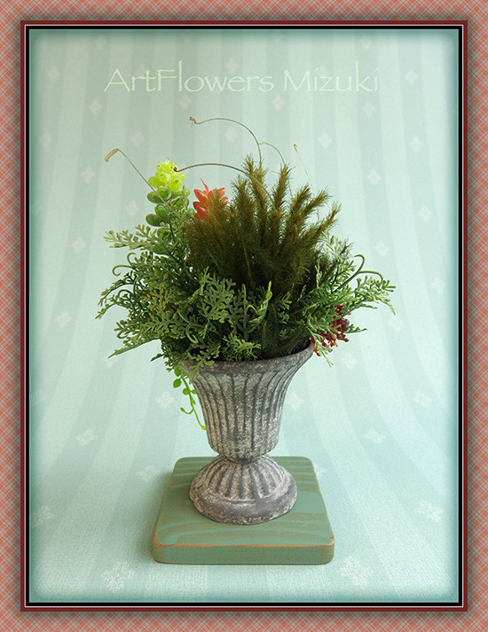 はい、では今日のお品の説明をしていきますよ!多肉植物とモスの寄せ植え風アレンジメントですね。