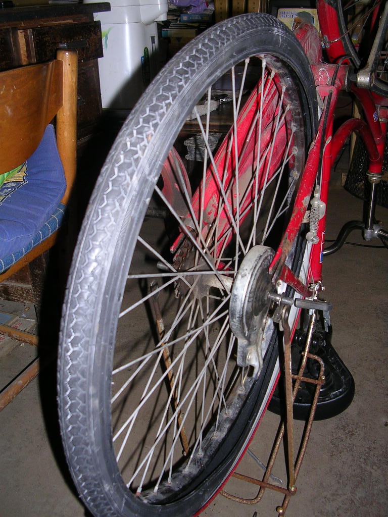なんとか外れて一段落、あとはタイヤをスポークにかけて、その中にうまくチューブをもぐりこませて、後は空気を入れて整えれば完成です。
