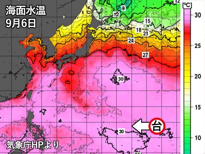 発生位置は今週日本に襲来した台風21号と近く、しばらくは21号と同様に海面水温が28℃以上の温かい海を進むことでエネルギーを得て発達する見込みです。