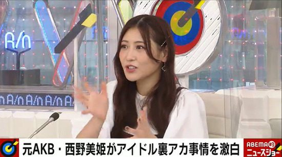 元AKB西野未姫「アイドルはみんな裏垢を持ってる。表には出せないプライベートを共有してる」 2021年10月12日 カテゴリ:卒業生 mixiチェック 1:47の素敵な:2021/10/11(月) 21:04:44.34 ID:.net 10/11(月) 17:50 東スポWeb 元AKB48西野未姫が語る アイドル “裏アカ事情”「持っているって公言しても特定されない」 アイドルの裏アカ事情を明かした西野未姫(©AbemaTV,Inc.) 元AKB48でタレントの西野未姫(22)が10日放送の「ABEMA的ニュースショー」に出演し〝アイドルの裏アカ事情〟を明かした。 西野は「『裏アカを持っている』って公言しても、特定されないんで…」と肯定のコメント。続けて「私も裏アカを持っています。友達もみんな持っていますね。仲いい人とか、プライベートを知られてもよい友達だけに裏アカを公開している」と明かした。 西野はSNSを駆使するアイドルの裏アカ事情について次のように語った。 「アイドルのアカウントではかわいい姿とか、みんなに見せてもいい姿を投稿するけど、裏アカはガチのプライベートを投稿している。 アイドルのアカウントで『今、ここの海に来ている』とか『実家に帰っている』とか投稿したら、現在地が特定されちゃうじゃないですか。アイドルの裏アカはそういう現在地についてとか『ここの服かわいい』とか『地元の友達とイェイ』とか、そういう内容が多いですね」 裏アカ事情を聞いたお笑いコンビ・ドランクドラゴンの鈴木拓は「その裏アカの名前教えてくださいよ!」と西野に懇願するも「なんでですか!? ダメですよ!」と一蹴。スタジオに笑いが巻き起こった。 https://news.yahoo.co.jp/articles/7e9d5df252585229c6920156b65a33d7fcdfa538 VIPQ2_EXTDAT: none:none:1000:512:: EXT was configured 【元AKB西野未姫「アイドルはみんな裏垢を持ってる。表には出せないプライベートを共有してる」】の続きを読む タグ :#西野未姫