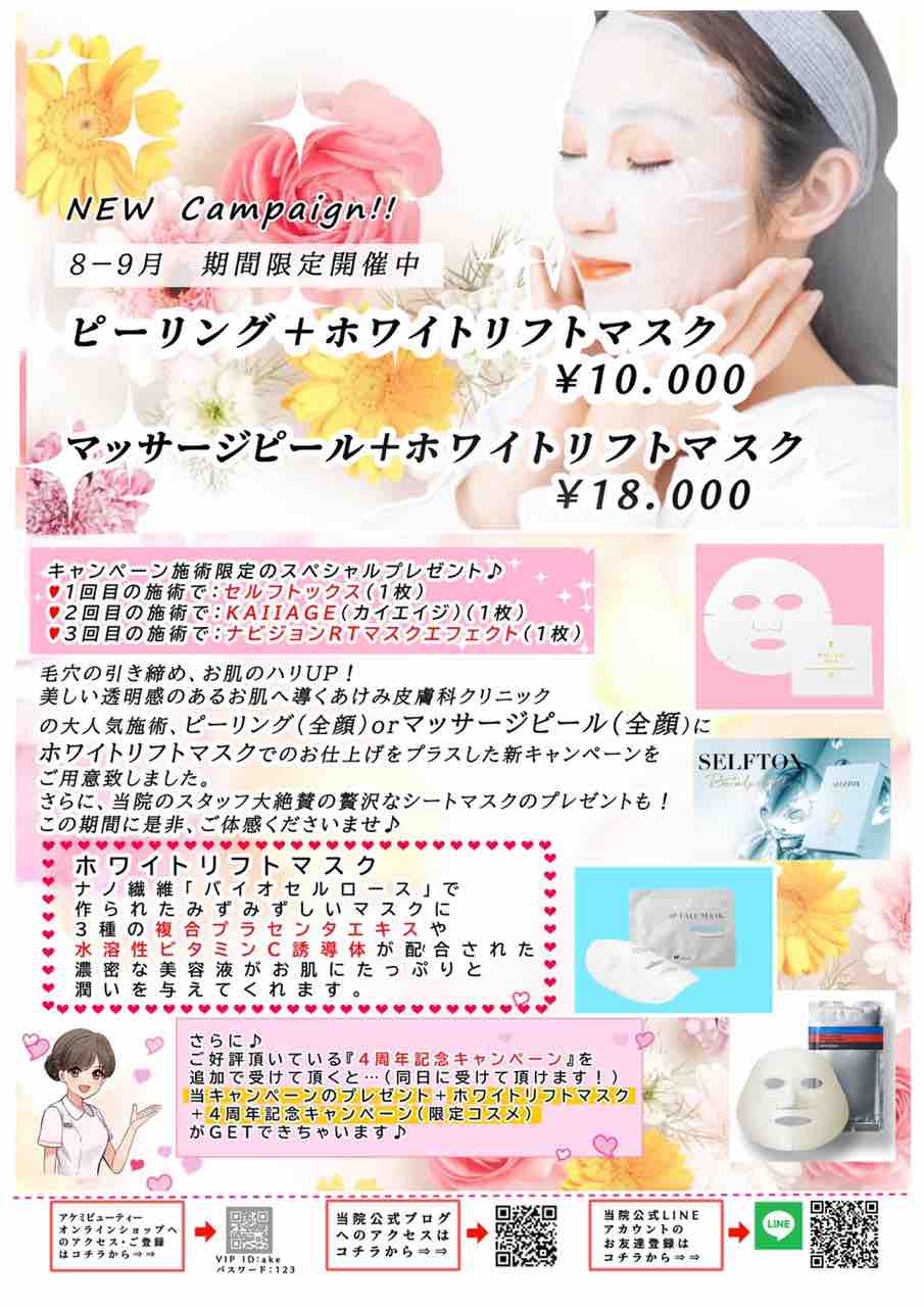 あけみ皮フ科クリニックの大人気の施術であるピーリング、もしくは、マッサージピールの後に、ホワイトリフトマスク💆🏻♀️を体感していただき、