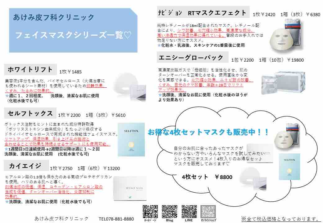 当院ではホワイトリフトマスクだけでなく施術とフェイスマスクを組み合わせることで効果が持続するもの、美白効果、リフトアップ効果など様々なお悩みにあったフェイスマスクを多数揃えております!