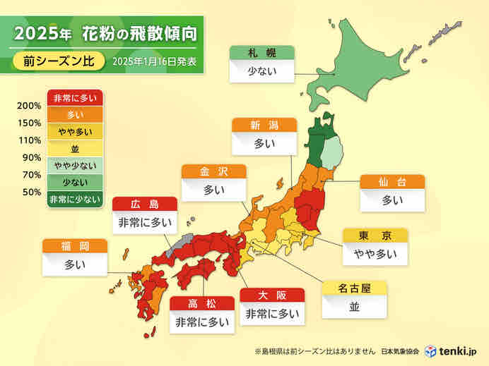 そのため高温・多照という花芽の形成に好条件となり、今年2025年の春の花粉飛散量は、九州から近畿では非常に多くなる見込みだそうです。