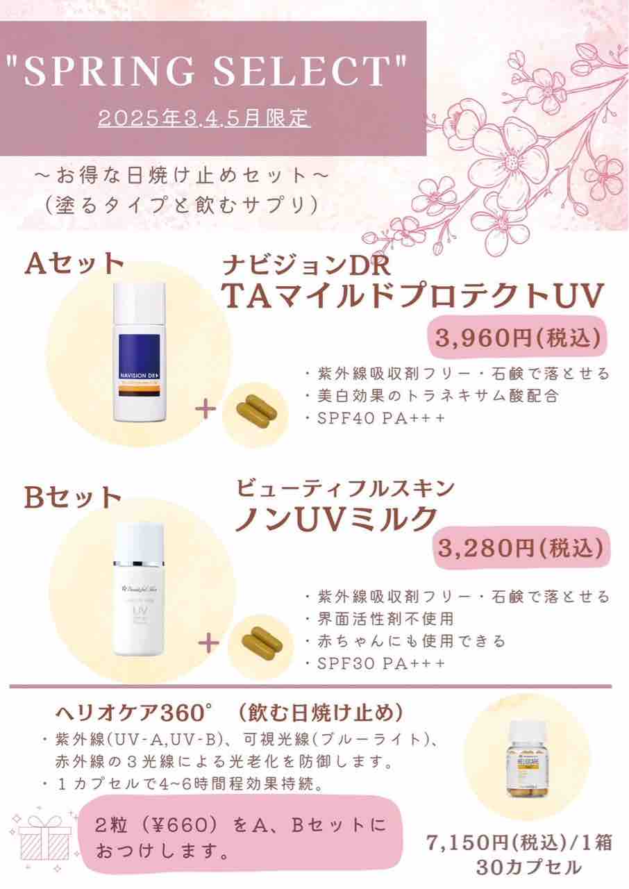 Aセット、Bセットにはそれぞれ飲む日焼け止めのヘリオケアを2粒💊(660円)をお付けしております🎁