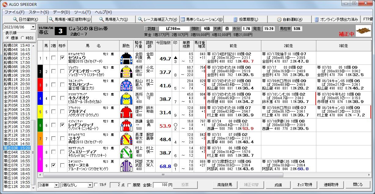 2023年08月07日 収支計(新馬戦以外全レース100円均等買いした場合)