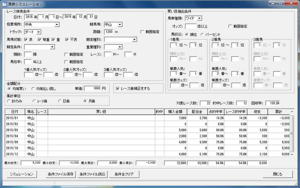 また、ver2.0.0以降で実装された「馬券シミュレーション」機能では、過去のレース結果をもとにしたシミュレーションが可能になりました。たとえば、「2015年の中山ダート1200m戦で、単勝1~2番人気に推された今回指数1位馬と2位馬のワイド1点を買い続けた場合(画面例)」といった条件でシミュレーション(回収率の算出等)が行えます。