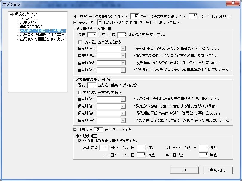 今回指数の計算方法は、オプション画面の「出馬表の今回指数」で設定することができます。
