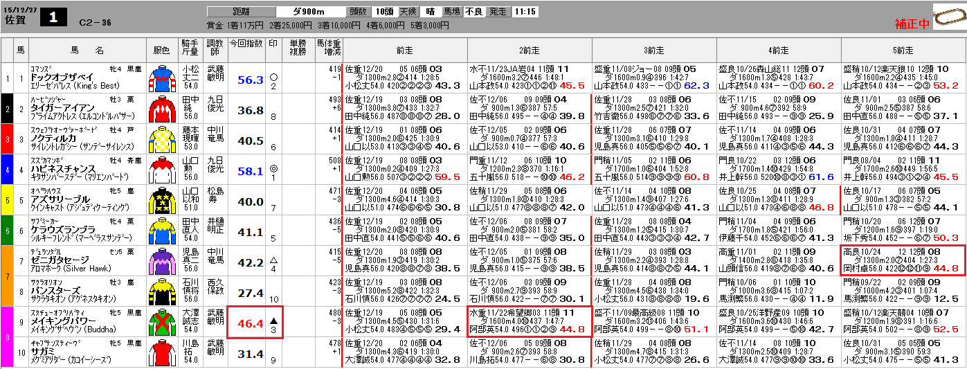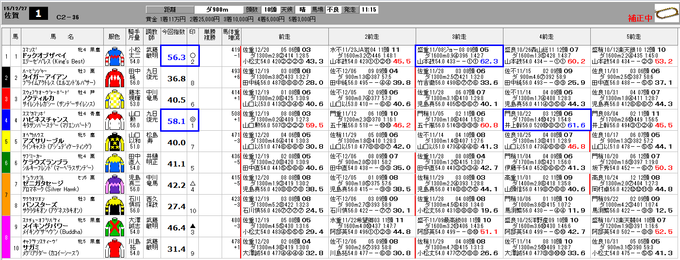 初期設定では、今回指数、過去指数ともに上位「1位」を青、上位「25%」以上を赤で表示しています。下の画面はこれを変更し、今回指数、過去指数の双方を「2位」以上に設定した例です。今回指数2位と、過去走のうち上位2位までが青の太字で強調表示されます(青枠)。
