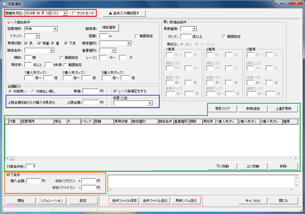 「自動運転」画面は以下の通りです。条件の入力欄はおおむね「馬券シミュレーション機能」と同様のため、ここではその他の部分について解説します。「馬券シミュレーション」と異なる部分は、実行日指定とテストモード(赤枠)、レースごとの金額上限設定(青枠)、自動運転を実行する条件のリスト(緑枠)、自動運転の終了条件の指定(橙枠)、そしてその他の部分(桃枠)です。「馬券シミュレーション」機能で条件ファイルを保存してある場合は、桃枠内の「馬券シミュ読込」ボタンからファイルを読み込むこともできます。