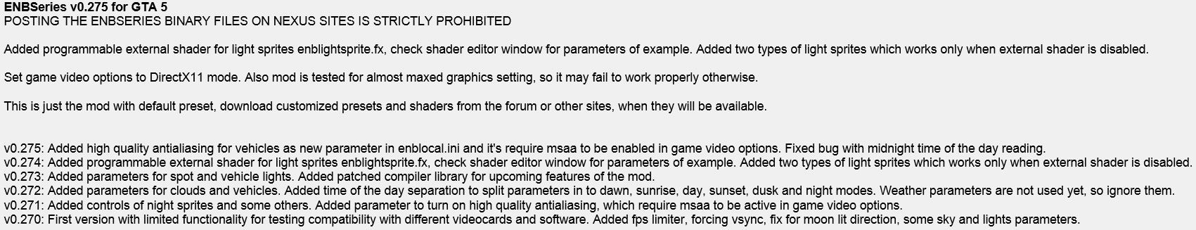v0.275: Added high quality antialiasing for vehicles as new parameter in enblocal.ini and it's require msaa to be enabled in game video options. Fixed bug with midnight time of the day reading.